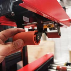 Félautomata dobozzáró ragasztógép nagy méretű kartondobozokhoz, motoros felső és alsó hajtószíjakkal