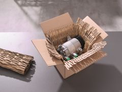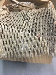 Hullámkarton papír perforátor. A berendezés segítségével hulladékkarton/doboz feldolgozásával gyártható hálós szerkezetű térkitöltő anyag.