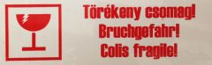 - Fehér alapon piros színnel nyomva, “Törékeny” felirat + piktogram
